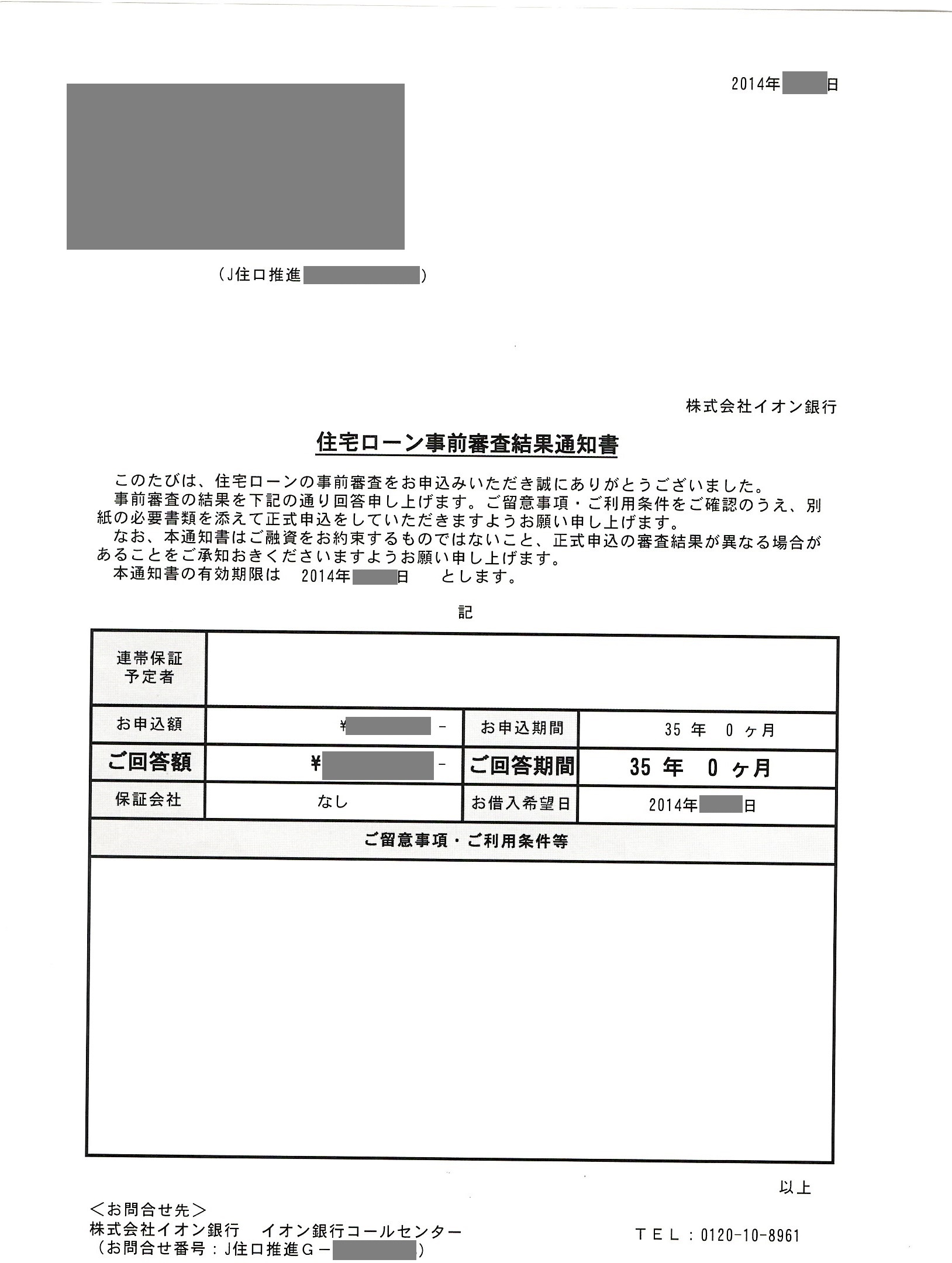 イオン銀行 住宅ローン事前審査結果通知書